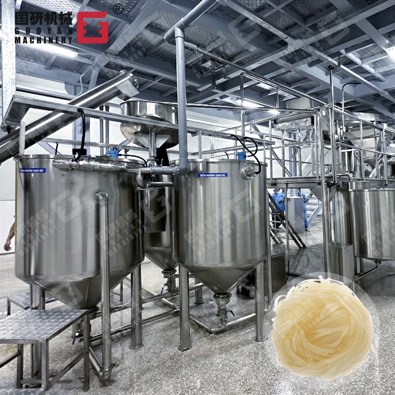大米→射流提升輸送→除砂石→射流洗米、浸米→米水分離→磨漿→篩濾→儲漿→蒸粉片→粉片預干→低溫自動吊掛老化→自動切條、切斷→定重壓形→干燥→包裝→成品